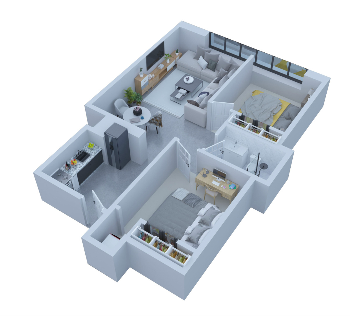 This modern 2-bedroom loft offers an open living space with oversized windows, a sleek kitchen with stone counters and stainless steel appliances, and two spacious bedrooms with large closets. Ideal for roommates or working from home, this layout also features a stylish bathroom, in-unit laundry, and keyless entry. Steps from the Rail Park, restaurants, and public transit.